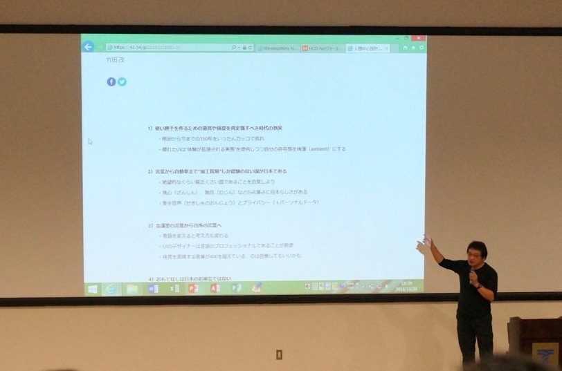 竹田 茂氏の講演は、 日本人の昔の価値観を見直す、言葉を大切にするという観点から、「あらためてHuman Centered Designの意味を考える」ことを示されたように感じました。お手本のないこれからのことを考えるときには生活の言葉を使うこと「会議室の言葉から台所の言葉へ」が重要で、たとえば 、socialの訳語は社会より世間、などがデザインのヒントにつながると感じました。